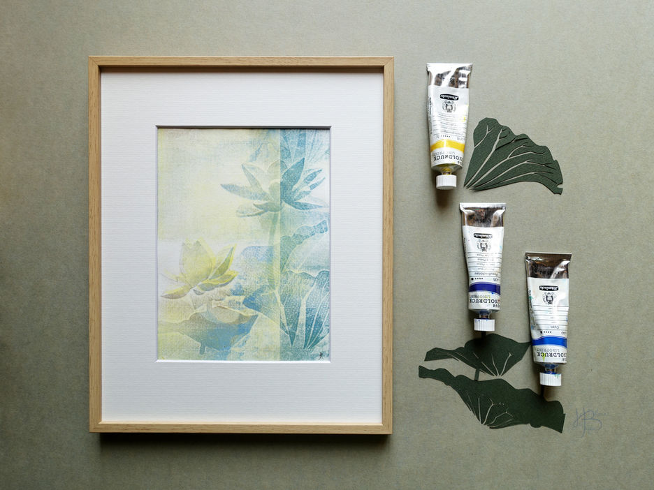 J'utilise ici des chutes de papier découpé provenant de certains de mes tableaux, ainsi que des végétaux récoltés dans la nature pour créer, à l'aide d'un rouleau enduit d'encre de linogravure, les motifs de ces affiches.